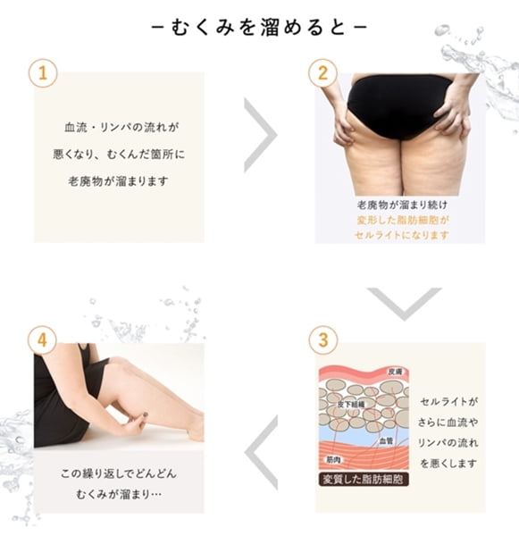 浮腫みは放っておくと血流やリンパの流れを悪くし、老廃物を溜めこんで、その老廃物が今度は脂肪細胞に変化し、憎っくき「セルライト」になり、またそこにどんどん老廃物がまたやってきてくっつくので、どんどん大きなセルライトになってしまいます。