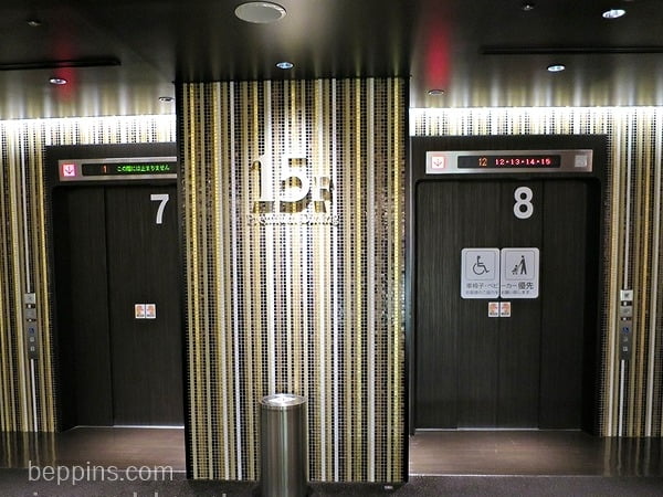 振り返ると、乗ってきたエレベーターのドア。15Fと壁に表示。