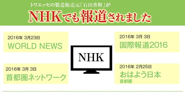 トワエッセ プレミアムエッセンスは、NHKのワールドニュースや、おはよう日本、国際報道2016、首都圏ネットワークで紹介されたことがあるんです。